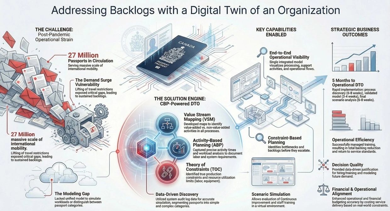 Service Canada utilized a Digital Twin of the Organization (DTO) using Collaborative Business Planning (CBP), supported by the QualiWare platform. Key elements of the approach included: